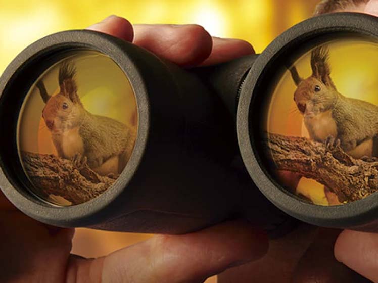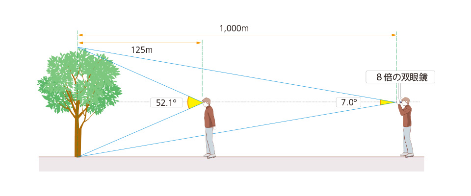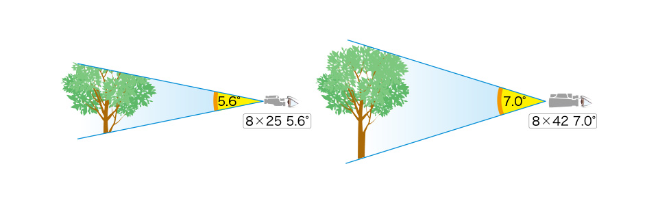 双眼鏡を動かさずに見ることのできる範囲を、対物レンズの中心から測った角度です。実視界が大きいほど見える視野は広くなります。たとえば動きの速い野鳥を視野に入れておくためには、実視界が広いほど有利です。また、天体観察でも実視界が広いほど小さい星雲、星団を見つけやすくなります。双眼鏡に8×42 7.0°と表示されている場合「7.0°」が実視界となります。