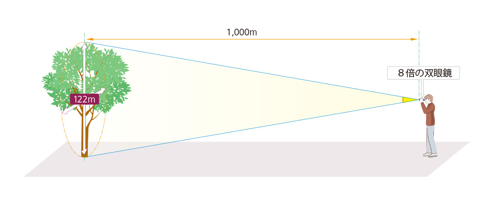 1000m先の物体を、双眼鏡を動かさないで見ることが出来る範囲をm(メートル)で表したものです。「8×42 7.0°」の双眼鏡の場合は、次の様にして計算されます。