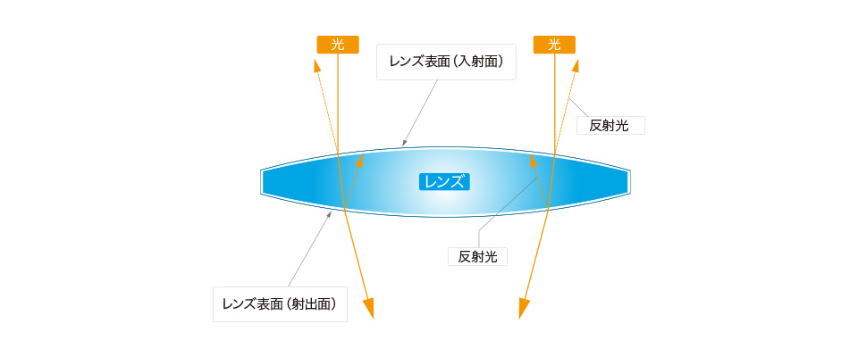 光がレンズを通るとき、その表面(入射面)と裏面(射出面)で光の一部が反射します。これによって透過する光の量が減少し、反射が多いと像は暗くなります。また、反射した光はフレアーやゴーストとなって像のコントラストに悪影響を与えます。そこで、より明るく鮮明な像を得るために、レンズの透過面に反射防止コート処理を行います。
