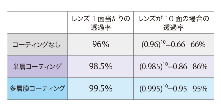 多層膜コーティングには、単層で除去できなかった反射光を何層ものコーティングによって減少させ、透過率を上げる効果があります。