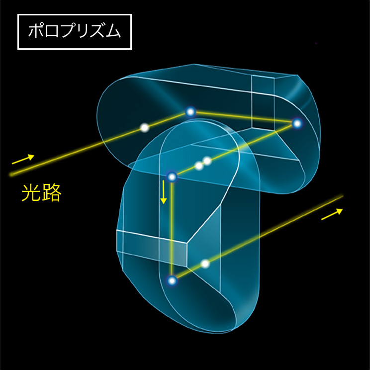 ポロプリズムは19世紀中頃にイタリア人のポロによって発明されました。すべての反射面が全反射するため、光の損失がなく加工も容易です。しかし、光路が乙状に折れ曲がるためのスペースが必要となり、ダハプリズムに比べると双眼鏡が大きくなります。