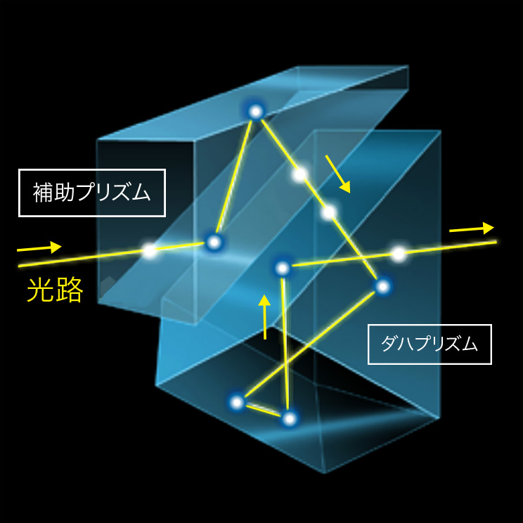 ダハプリズムのダハは、ドイツ語で「屋根」と言う意味です。プリズムの一部分が屋根の形をしているところから、この名称がつきました。反射面は全反射ではない面があるため光の損失がおこります。これを解消するための加工やダハ面の精度形成は高度で、精密な技術を必要とします。光路は直線的であるため、スマートでコンパクトな双眼鏡となります。