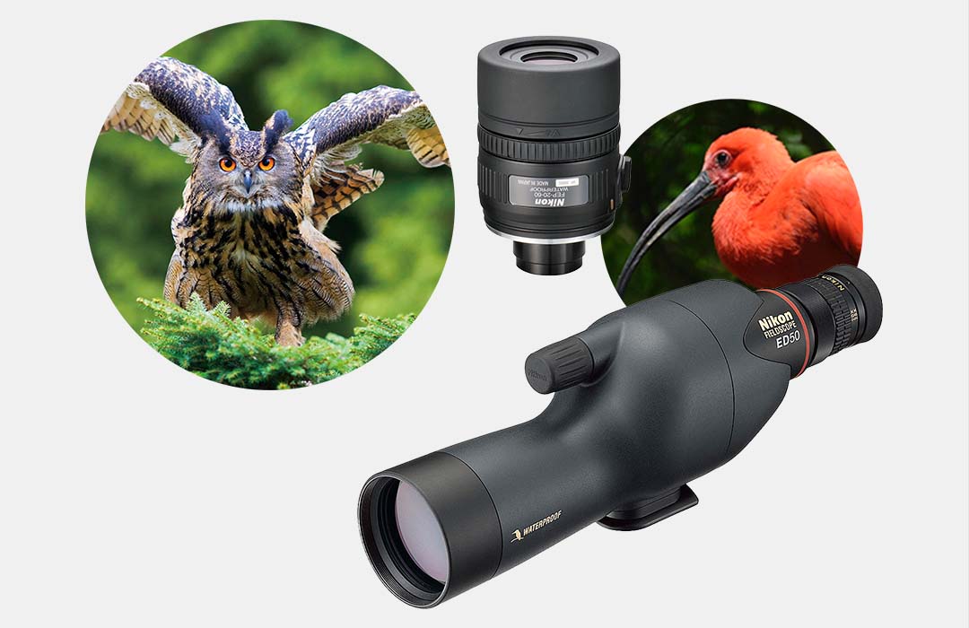 ニコンのフィールドスコープは、本体との接続方式が同じものは、接眼レンズを共通で使用できます。ひとつの接眼レンズを異なる対物有効径のフィールドスコープ本体に接続する場合、倍率や実視界も変わります。
