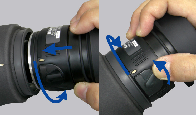 接眼レンズを右に回して、スコープ本体の接眼レンズ取り付け部に接続します。