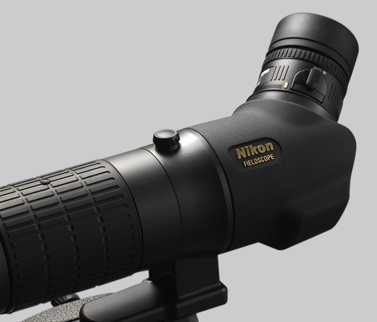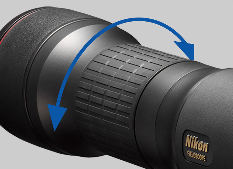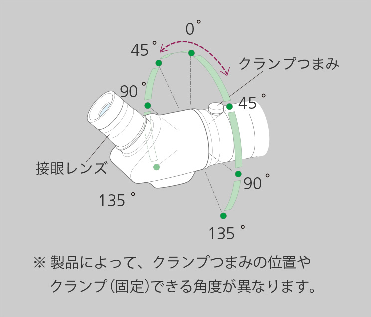 傾斜型のフィールドスコープは、使用状況によって接眼部を左右に傾けることが可能で、クランプつまみを使ってクリック位置でクランプ(固定)できます。